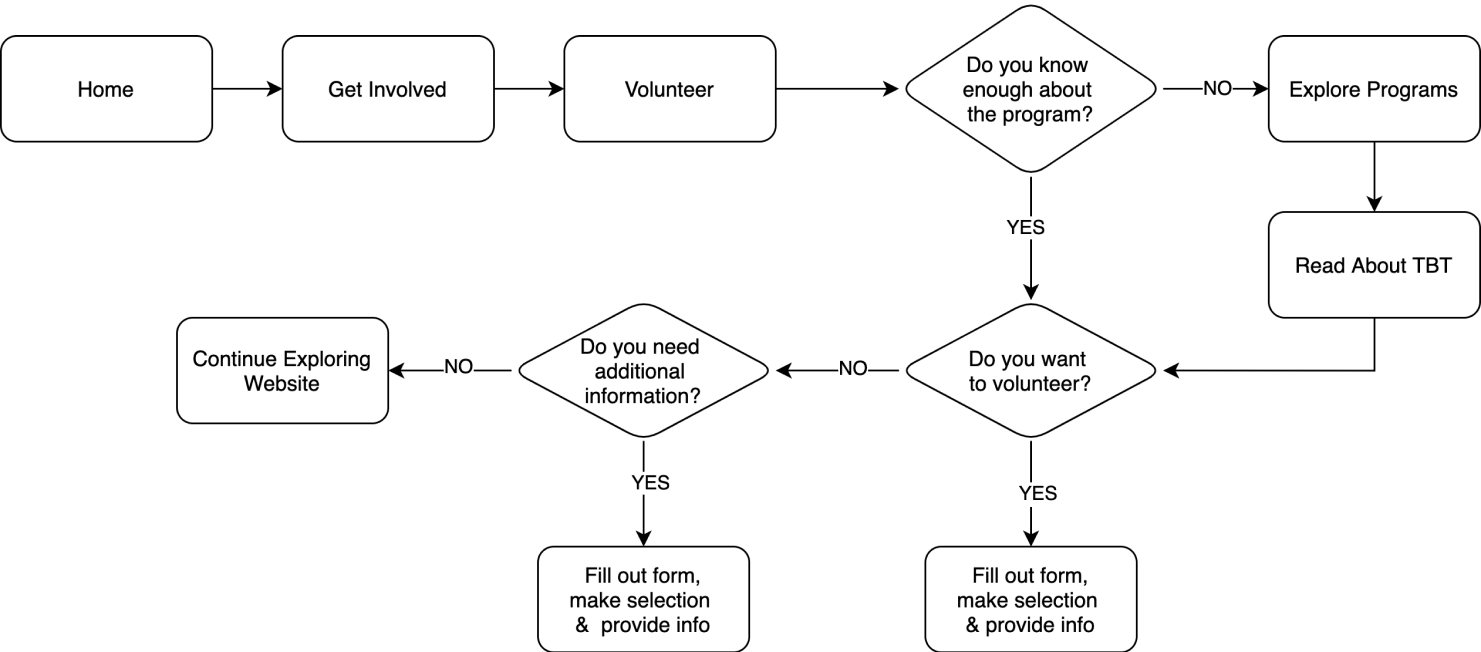 Since our main challenge in redesigning TBT’s website is to attract and retain volunteers, it seemed fitting to focus on a user flow with the end goal of signing up to become a volunteer OR set up a meeting to get more information. We also updated the sitemap to better group information for easier navigation.